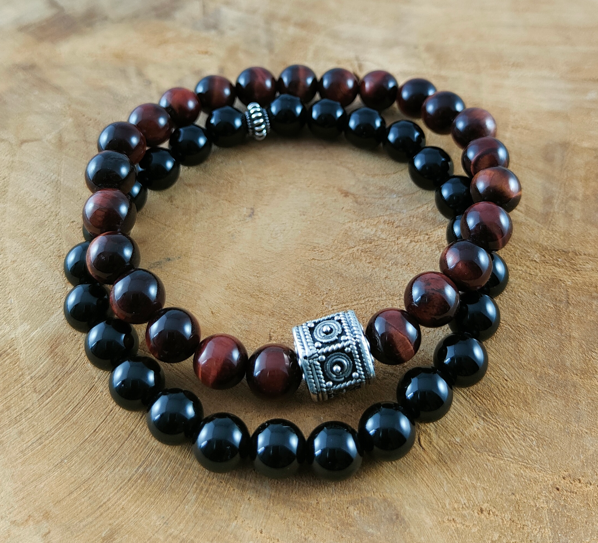 Set Rood Bruine tijgeroog en Zwarte Onyx 8mm Armbanden met hand bewerkte 925 zilveren kraal