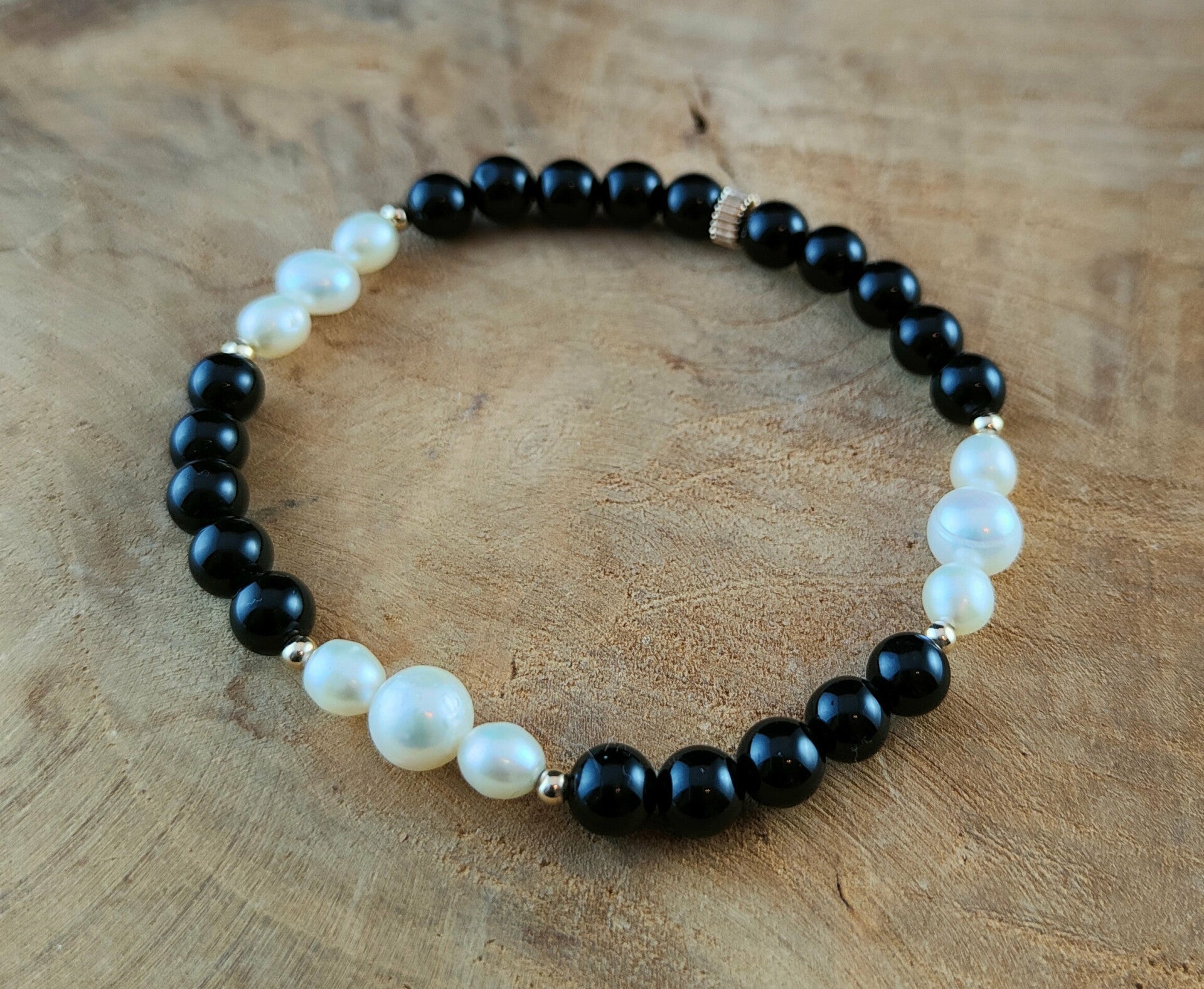 Zwarte Onyx en Parels Armband 6 mm met 14K/20 Gold spacers